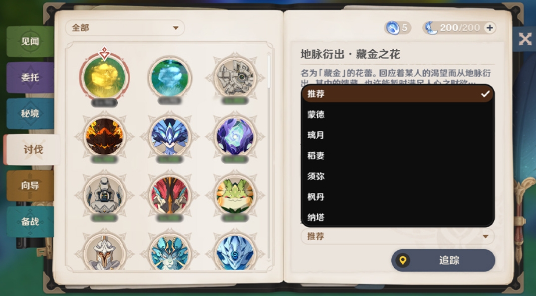 5、討伐新增地脈花,選擇地區(qū)后可一鍵追蹤,同時新增查看目標首領(lǐng)特性/抗性/弱點的功能