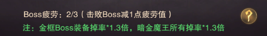 挑戰(zhàn)BOSS需要消耗BOSS疲勞,每天有3次的免費(fèi)挑戰(zhàn)機(jī)會(huì)。隨著轉(zhuǎn)生等級(jí)的提高,可以挑戰(zhàn)的層數(shù)就越高,其中每層的黃金領(lǐng)主與暗金魔王裝備掉率是1.3倍,建議把次數(shù)都用于挑戰(zhàn)這兩個(gè)BOSS。