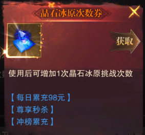 挑戰(zhàn)機(jī)會(huì):成為SVIP后可以通過花費(fèi)20泰坦幣來購買多1次挑戰(zhàn)機(jī)會(huì)。也可以使用晶石冰原次數(shù)券來增加挑戰(zhàn)次數(shù)。晶石冰原次數(shù)券獲得的途徑比較多,